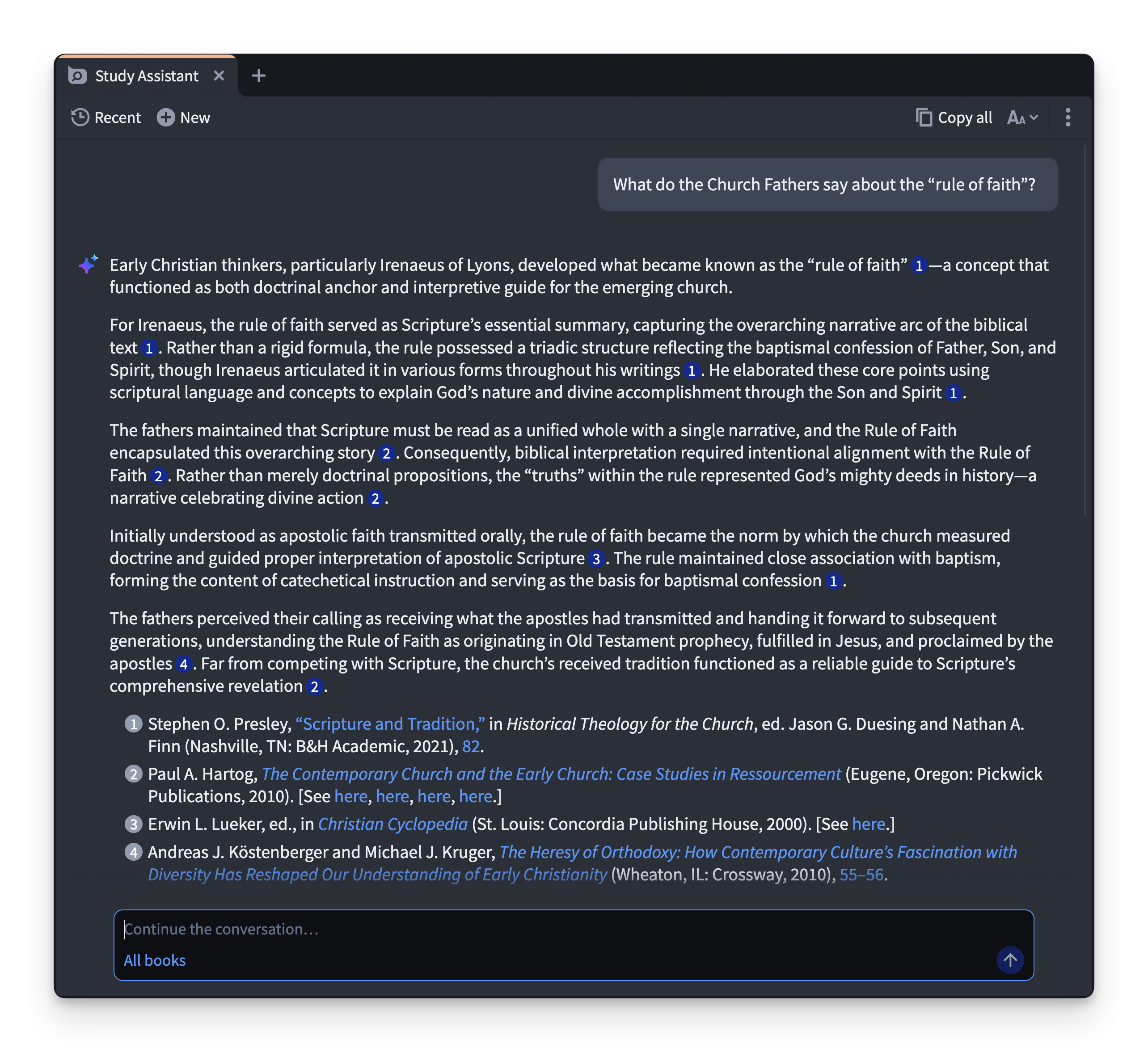 예를 들어, “교부들은 [연구 중인 주제]에 대해 무엇이라 말했는가?“라고 질문하면, 스터디 어시스턴트가 여러분의 서재를 검색하여 Logos 자료를 바탕으로 정확한 답변을 찾아줍니다. 답변에 포함된 인용된 내용들은 정확할 뿐만 아니라 클릭을 통해 관련 소스 자료로 즉시 이동하여 내용을 직접 확인하고 연구의 깊이를 더할 수 있습니다.