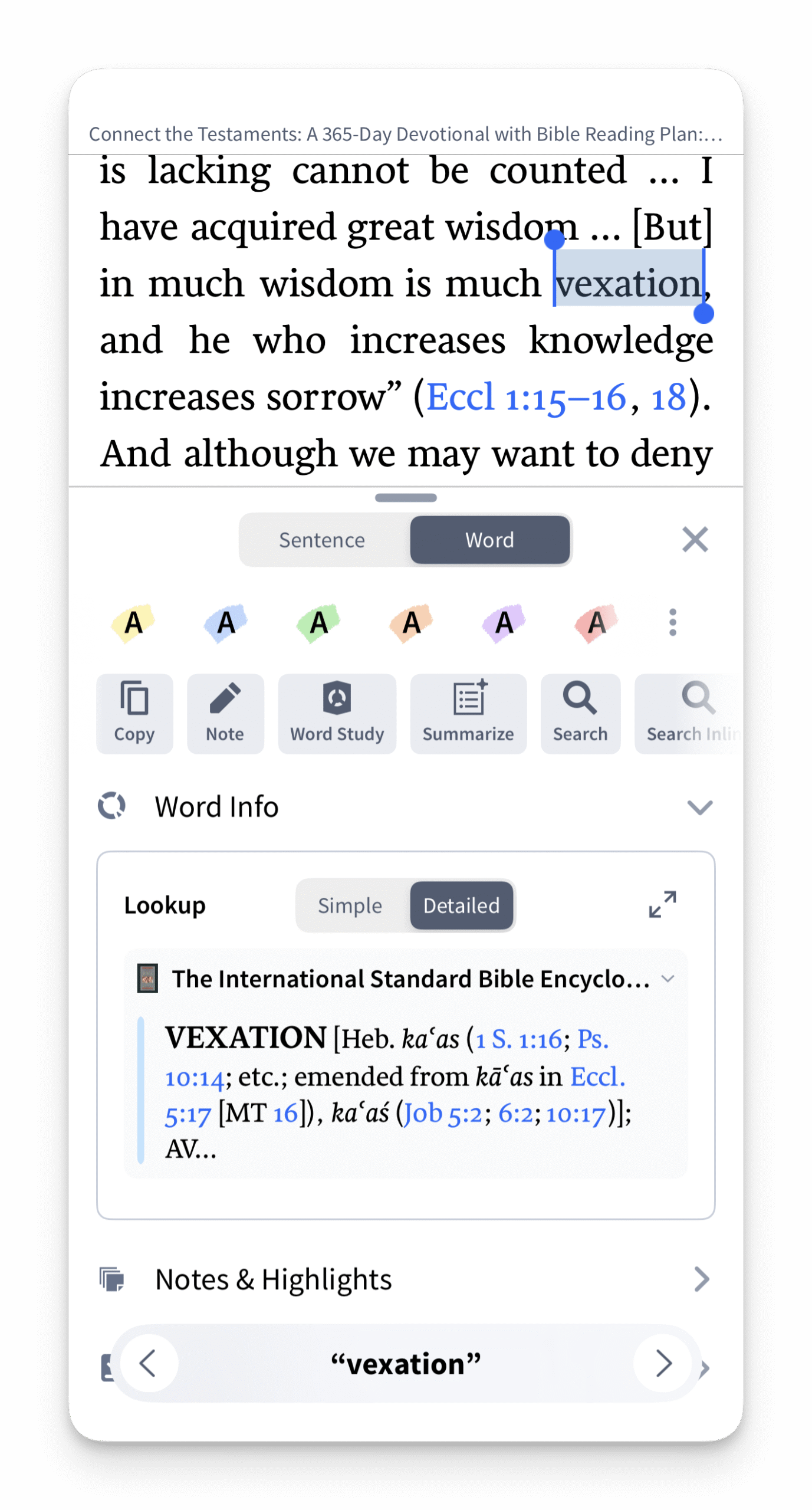 새롭게 바뀐 단어 조회(Lookup) 카드는 탐색이 매우 간편합니다. ‘단순’ 보기(Simple view)를 선택하면 사전의 주요 정의를 보여주며, 더 상세한 백과사전식 설명을 원하신다면 ‘상세’보기(Detailed view)를 선택하면 됩니다.참고: 헬라어나 히브리어 정보가 포함된 단어의 경우, 새로운 ‘Lookup 카드’ 대신 기존의 ‘단어 정보‘ 카드가 나타납니다.
